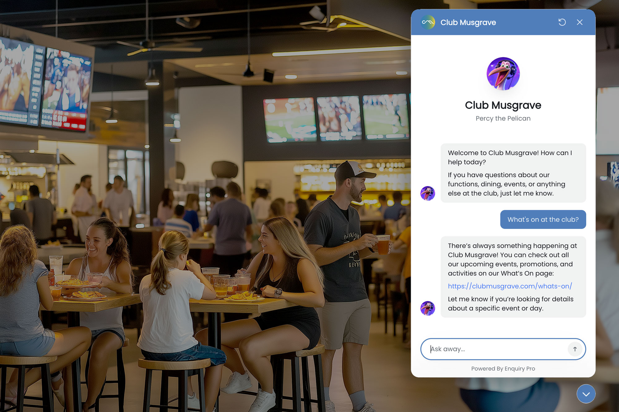 Whether a guest is asking about function spaces, table bookings, opening hours, live entertainment or upcoming events, Enquiry Pro provides fast, helpful responses while guiding them to the right information.